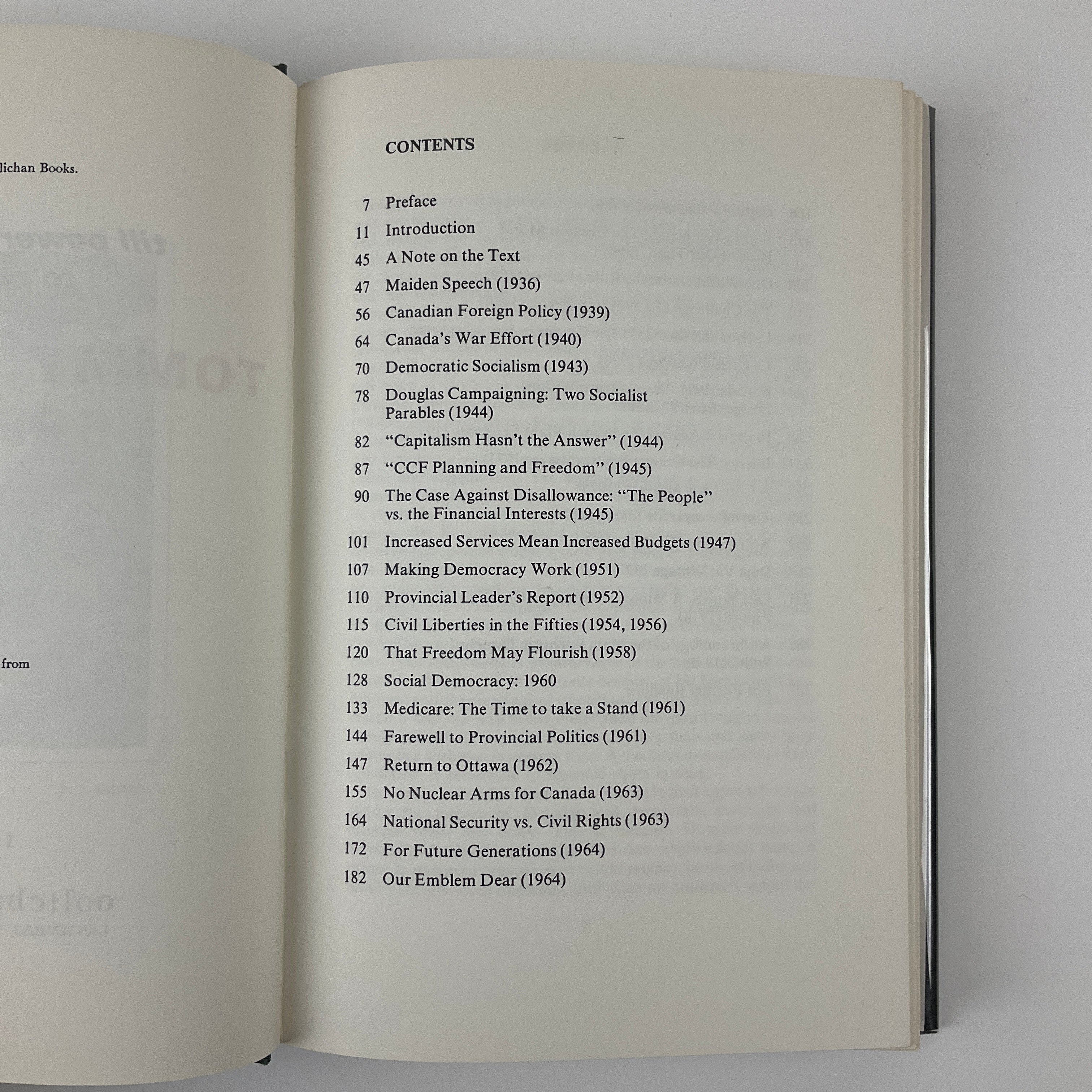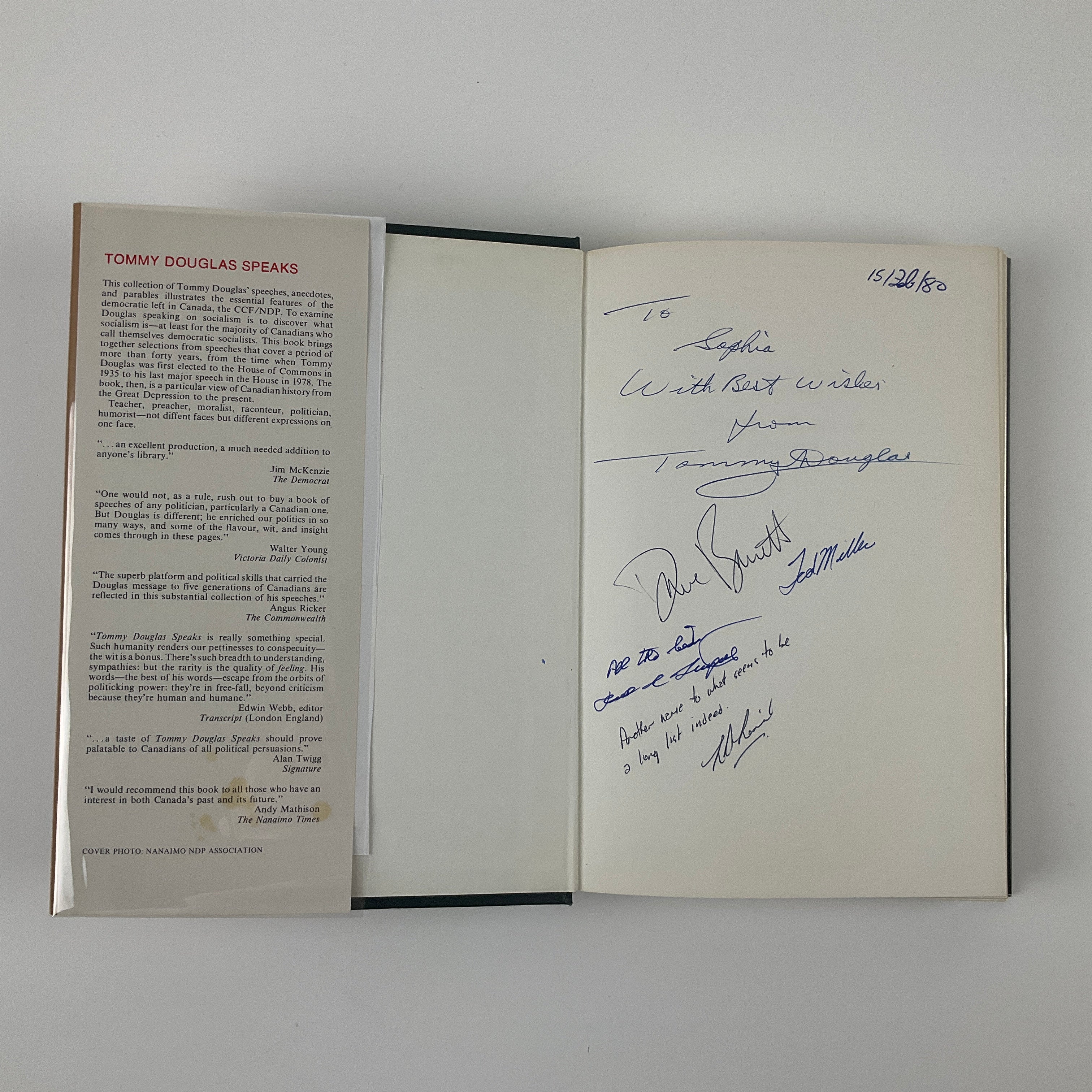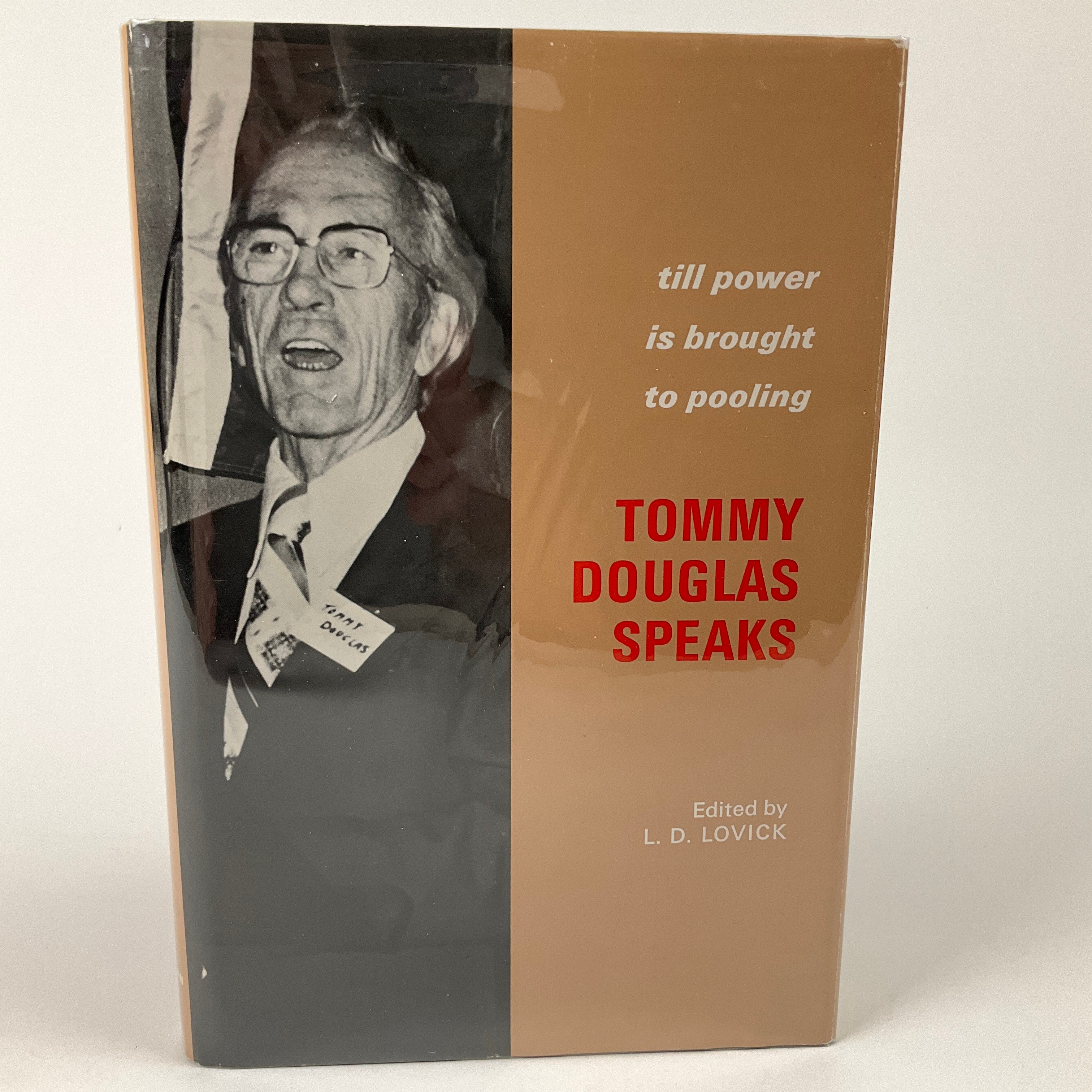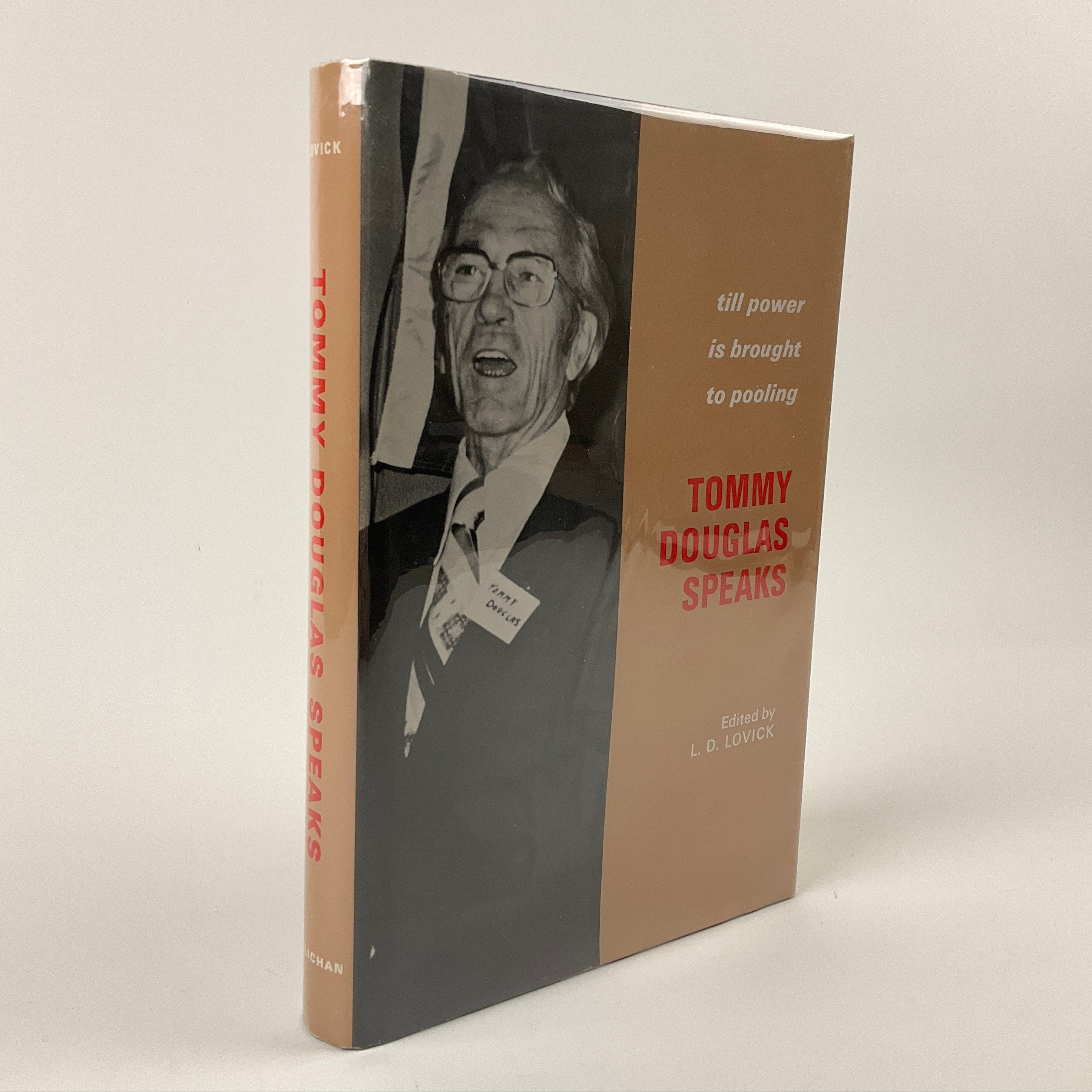 Educated in Manitoba and employed as a preacher in Weyburn, Saskatchewan, Tommy Douglas (1904-1986) became a prominent prairie politician. He served five terms as Premier of Saskatchewan and was leader of both the Co-Operative Commonwealth Federation and New Democratic Party. This volume contains excerpts from 35 speeches given by Douglas throughout his political career. The speeches demonstrate Douglas’ politics, expressing his stance on topics such as socialism and civil rights. The book also traces Douglas’ response to provincial, federal, and global issues ranging from Medicare to the October Crisis. Editor L. D. Lovick provides a brief contextual introduction to each speech and opens the volume with a biography of Douglas. The ffep. is a flurry of inscriptions and signatures by NDP members including Tommy Douglas, Dave Barrett (Premier of British Columbia), and Ted Miller (MP for Nanaimo-Alberni).
