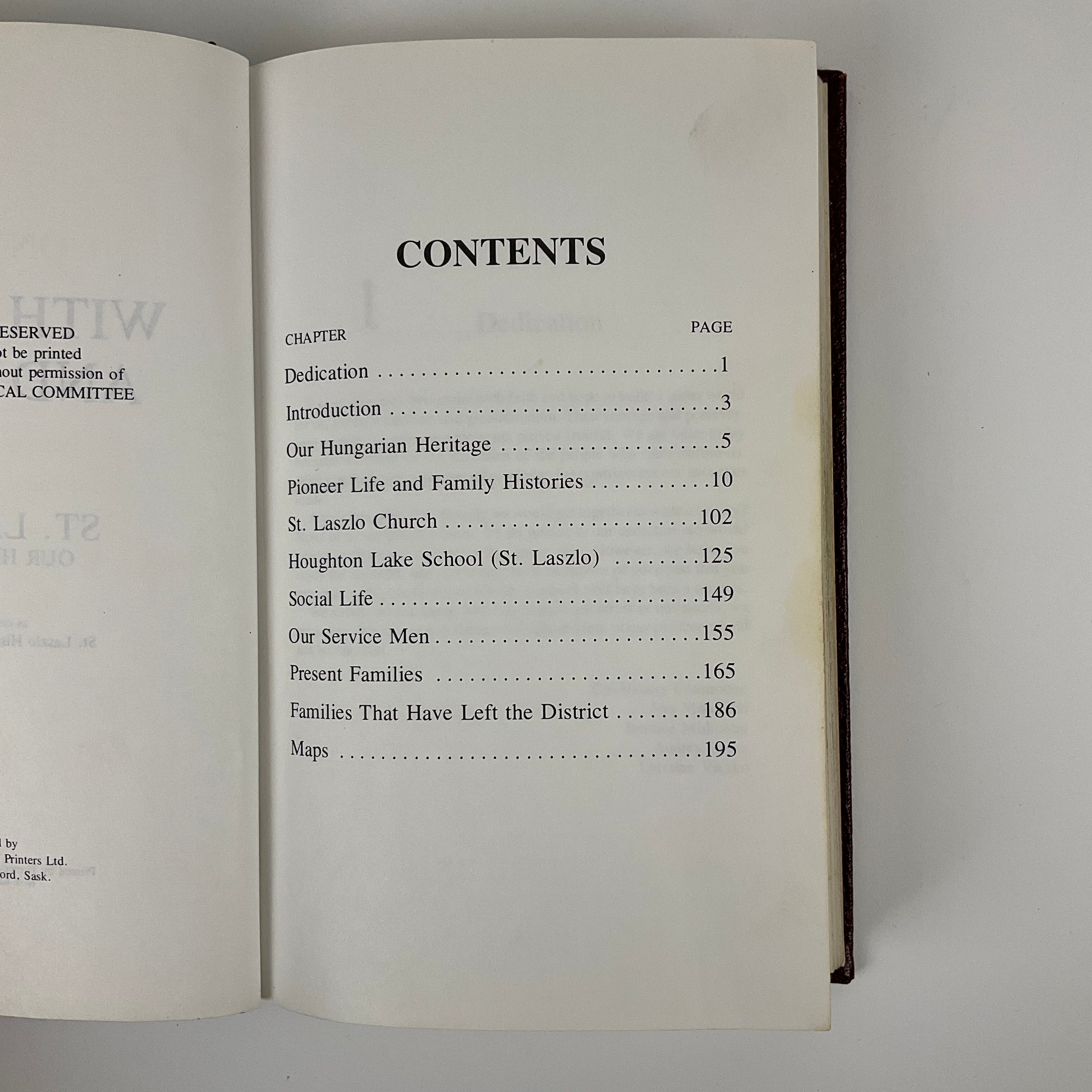 This volume contains a community history of St. Laszlo’s Parish (near the village of Prud’Homme, in Saskatchewan’s Rural Municipality of Bayne #371). The book consists mainly of family histories pertaining to – or contributed by – the area’s early homesteaders and current/former residents. Acknowledging the Hungarian and Catholic background of many residents, the book includes sections on Hungarian immigration to Canada in the early 1900s as well as St. Laszlo Catholic Church. Topical chapters on local schools, social life, and veterans also appear. Family photos and copies of historical documents appear liberally throughout.